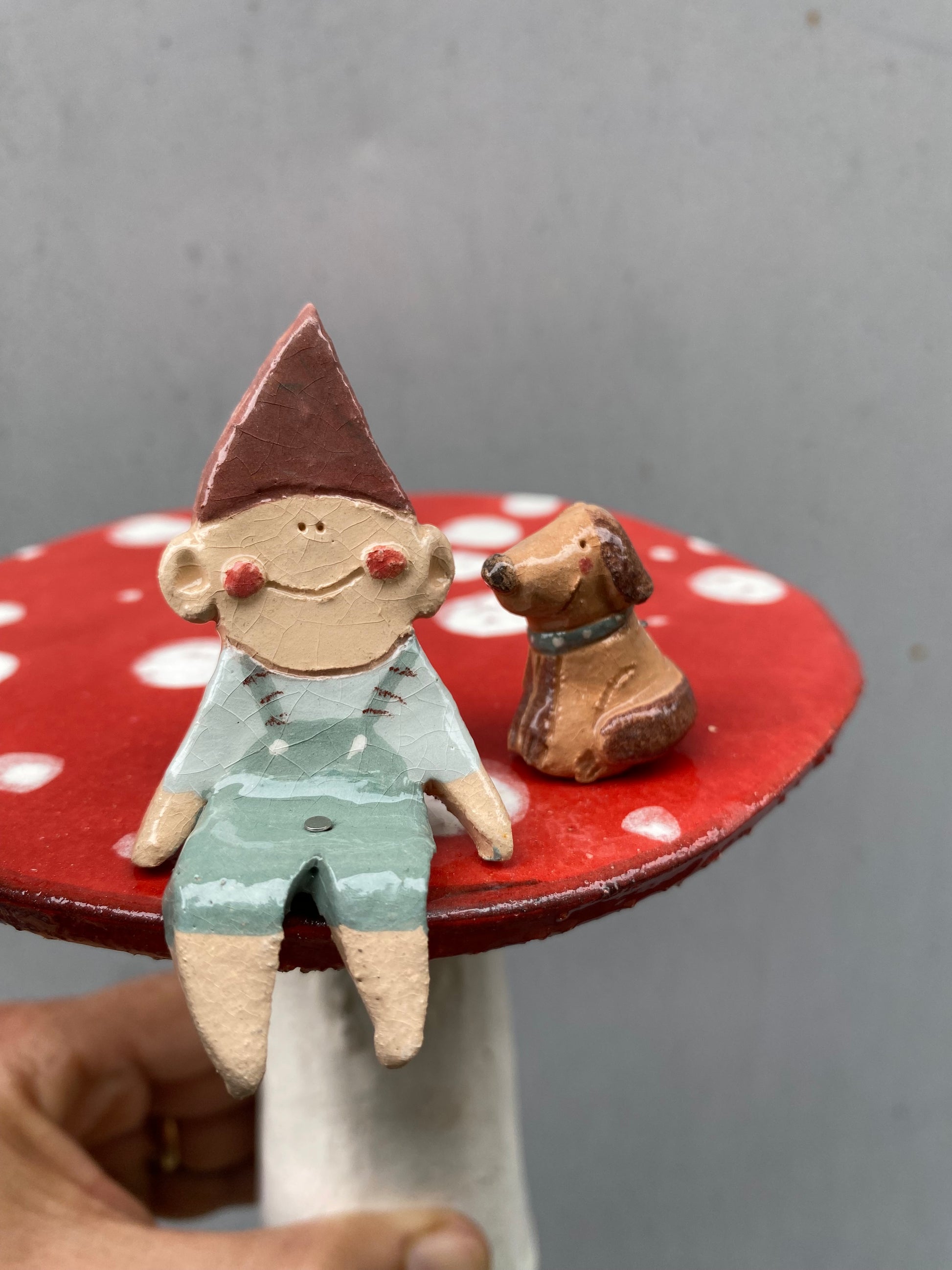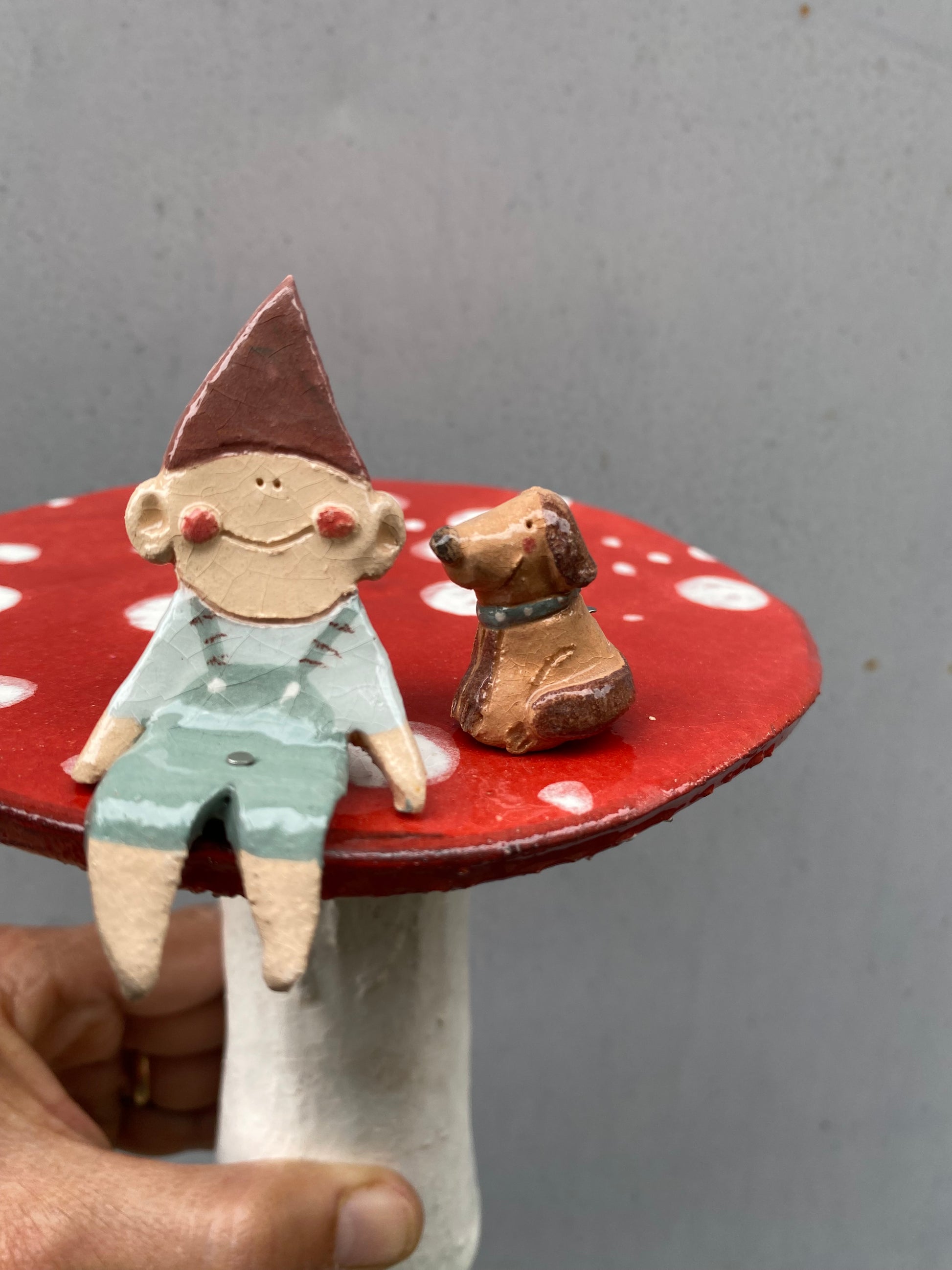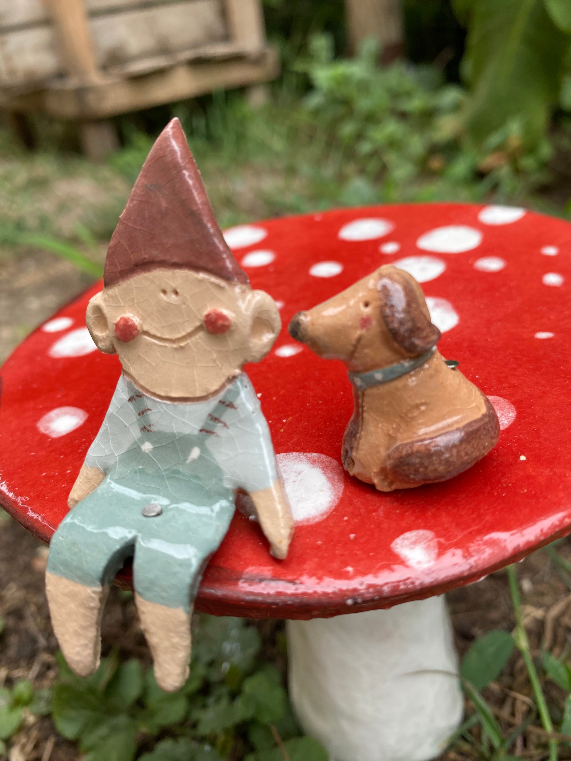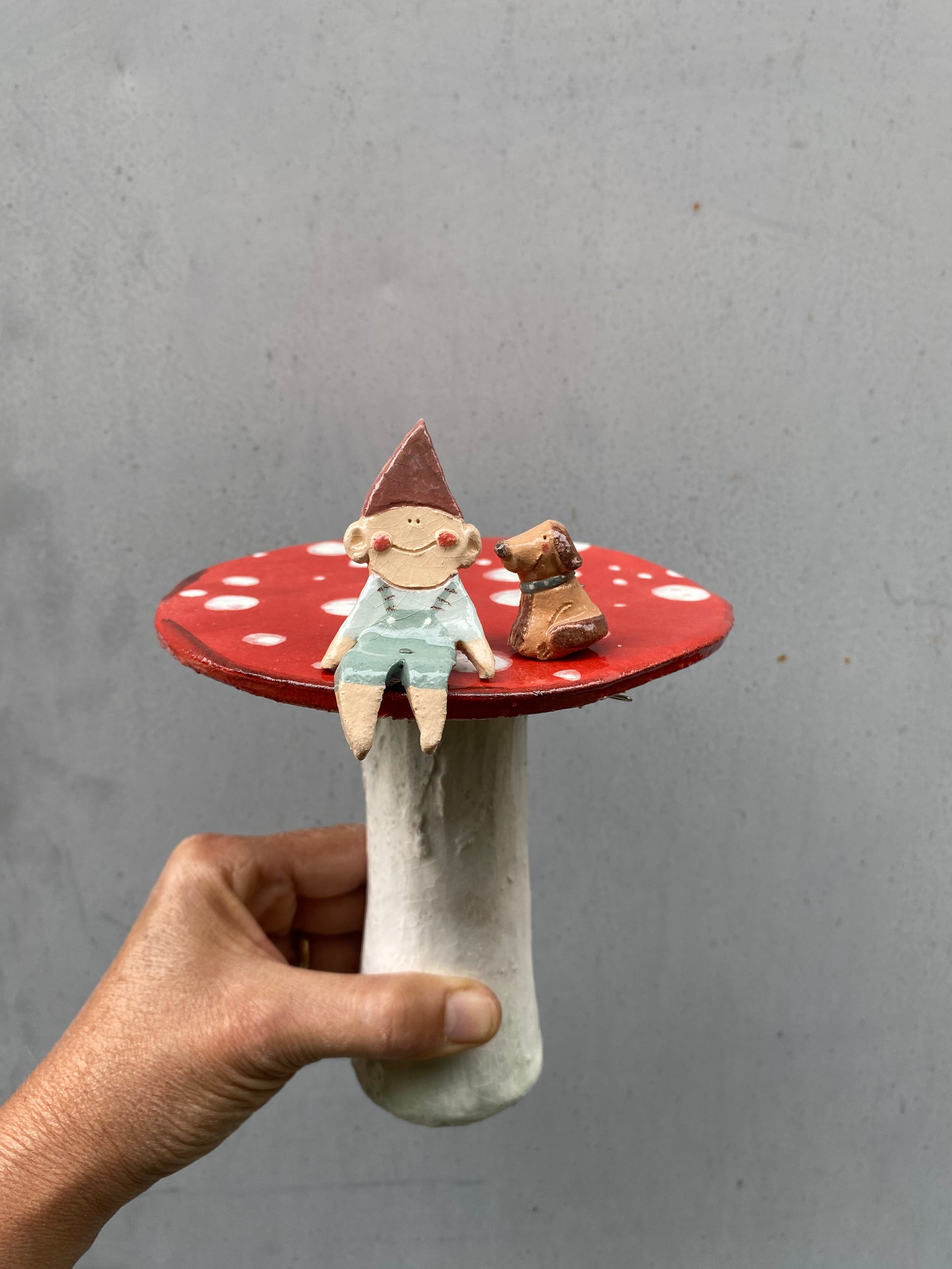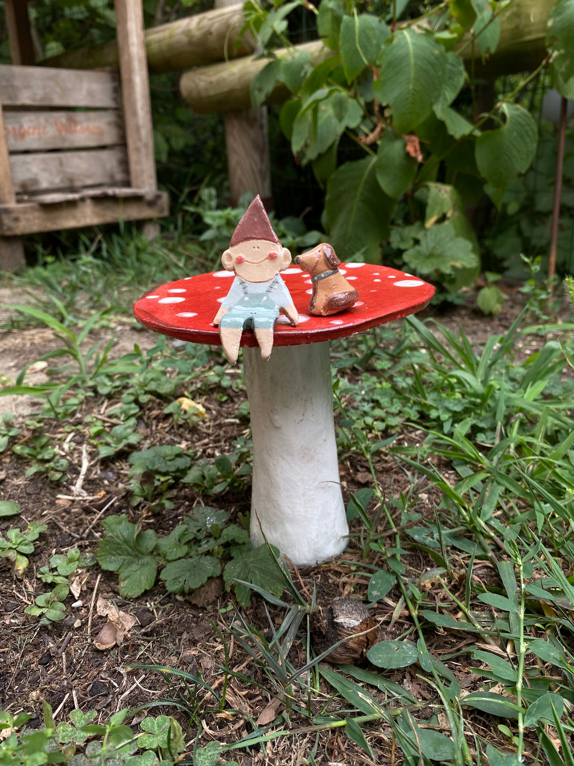 Fungo alto 14 cm con un folletto alto circa 6 cm e un cagnolino. Nella scatola troverai un tondino in ferro alto circa 15 cm per infilare il fungo in giardino o vaso e due spilli di ferro per infilare i folletti nel fungo