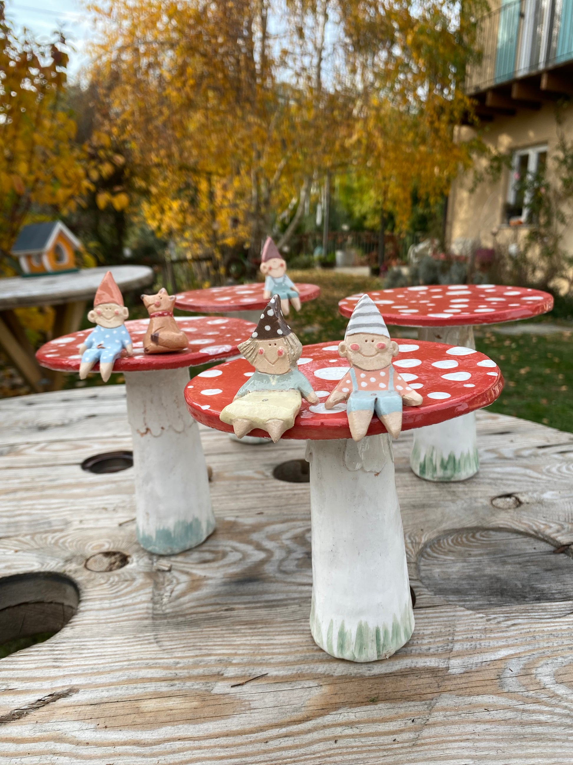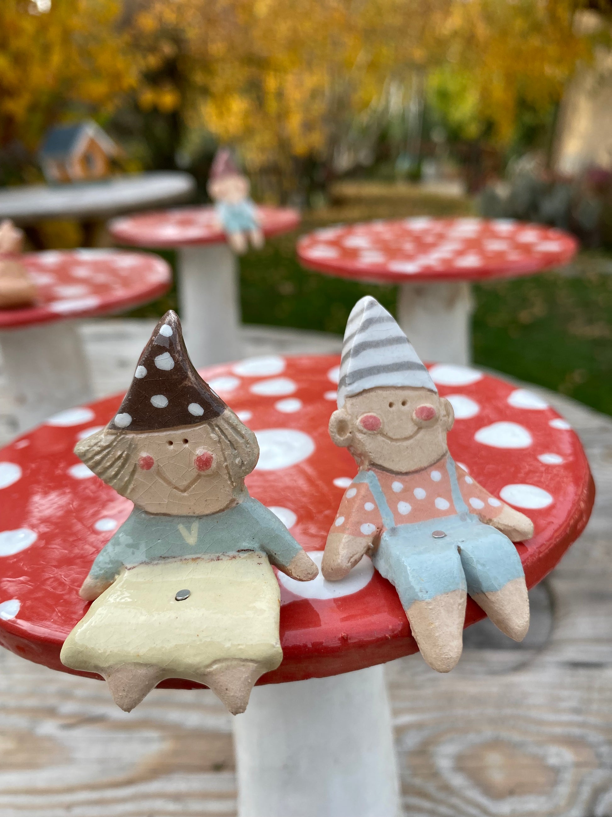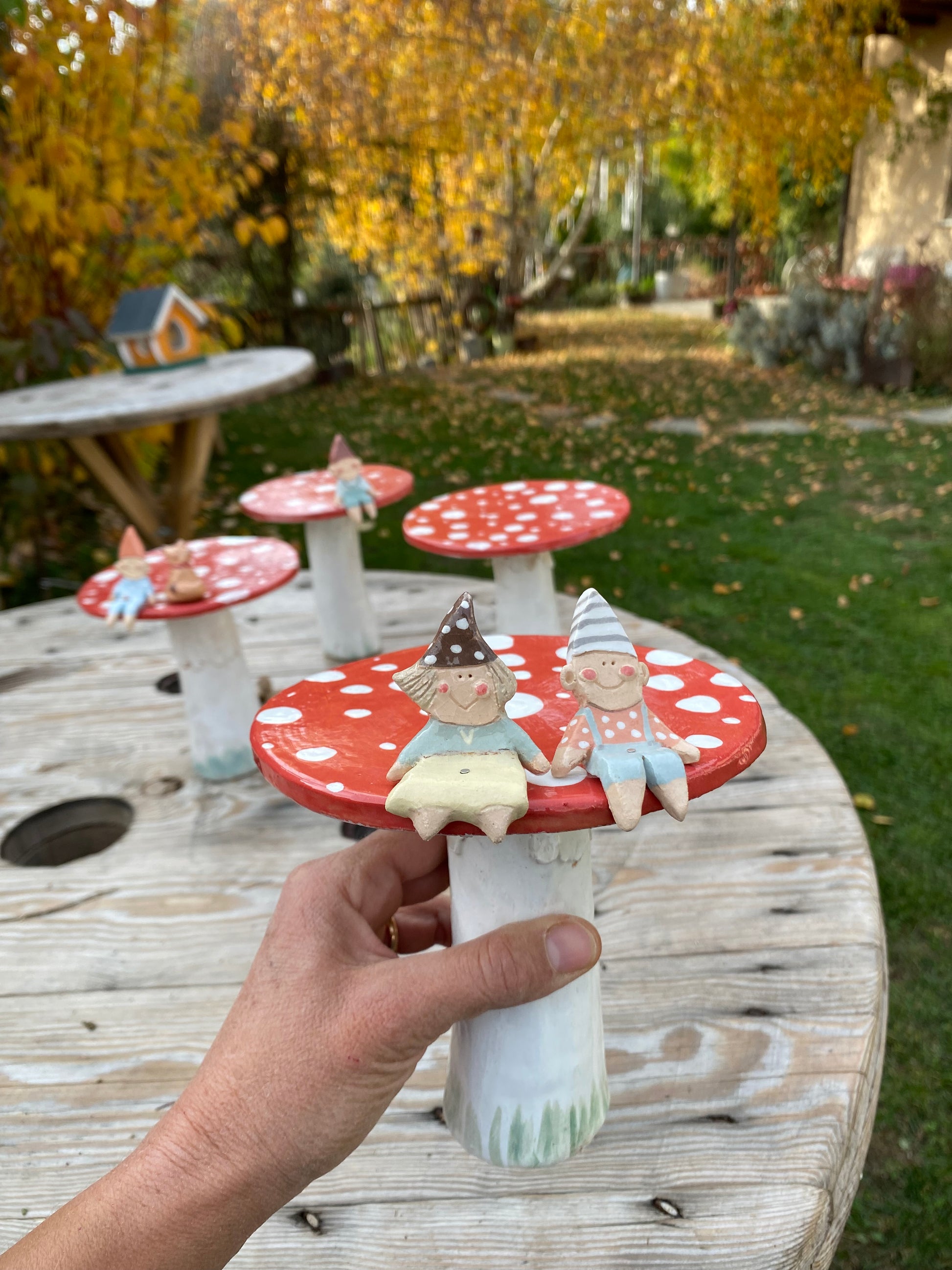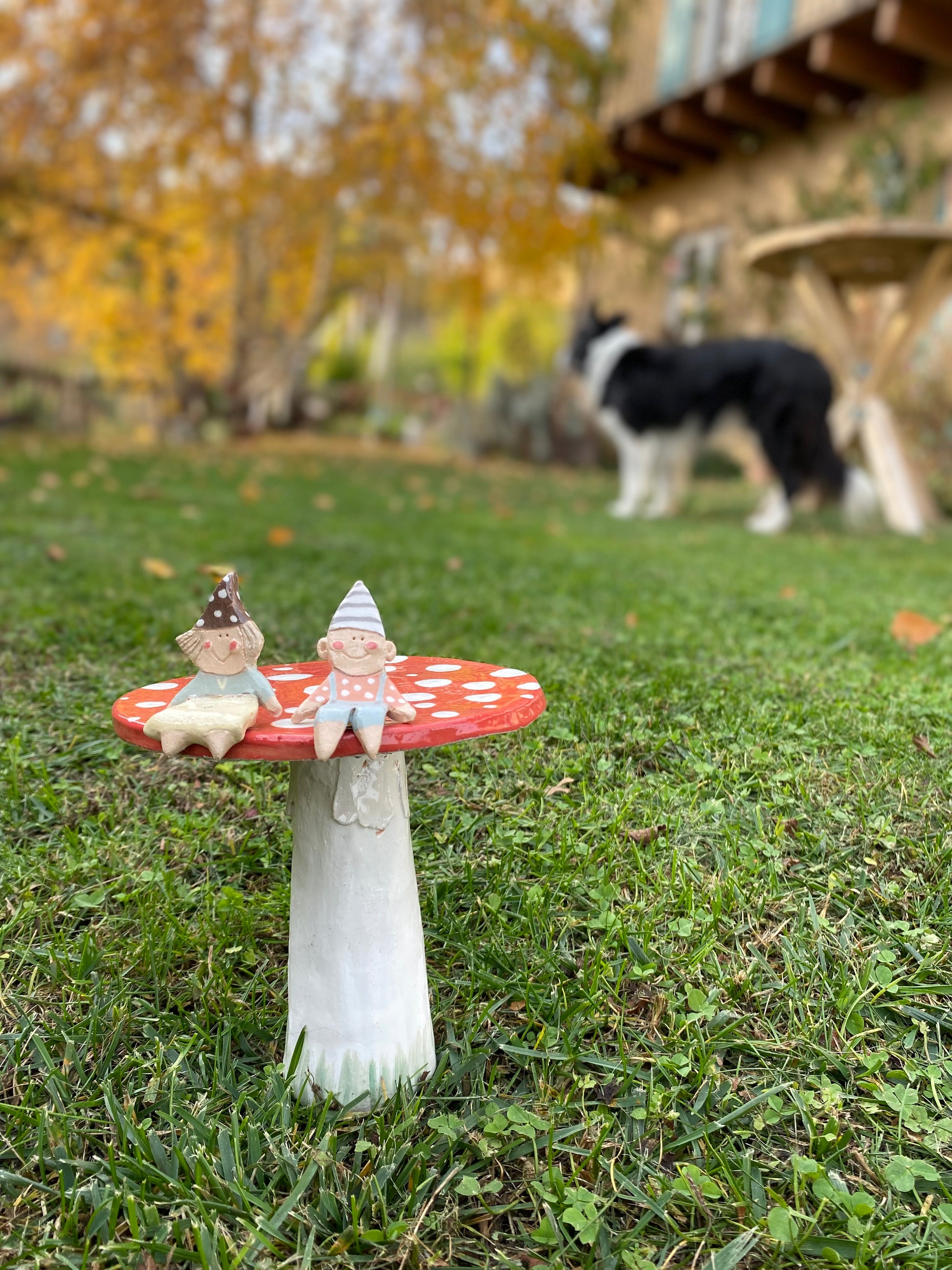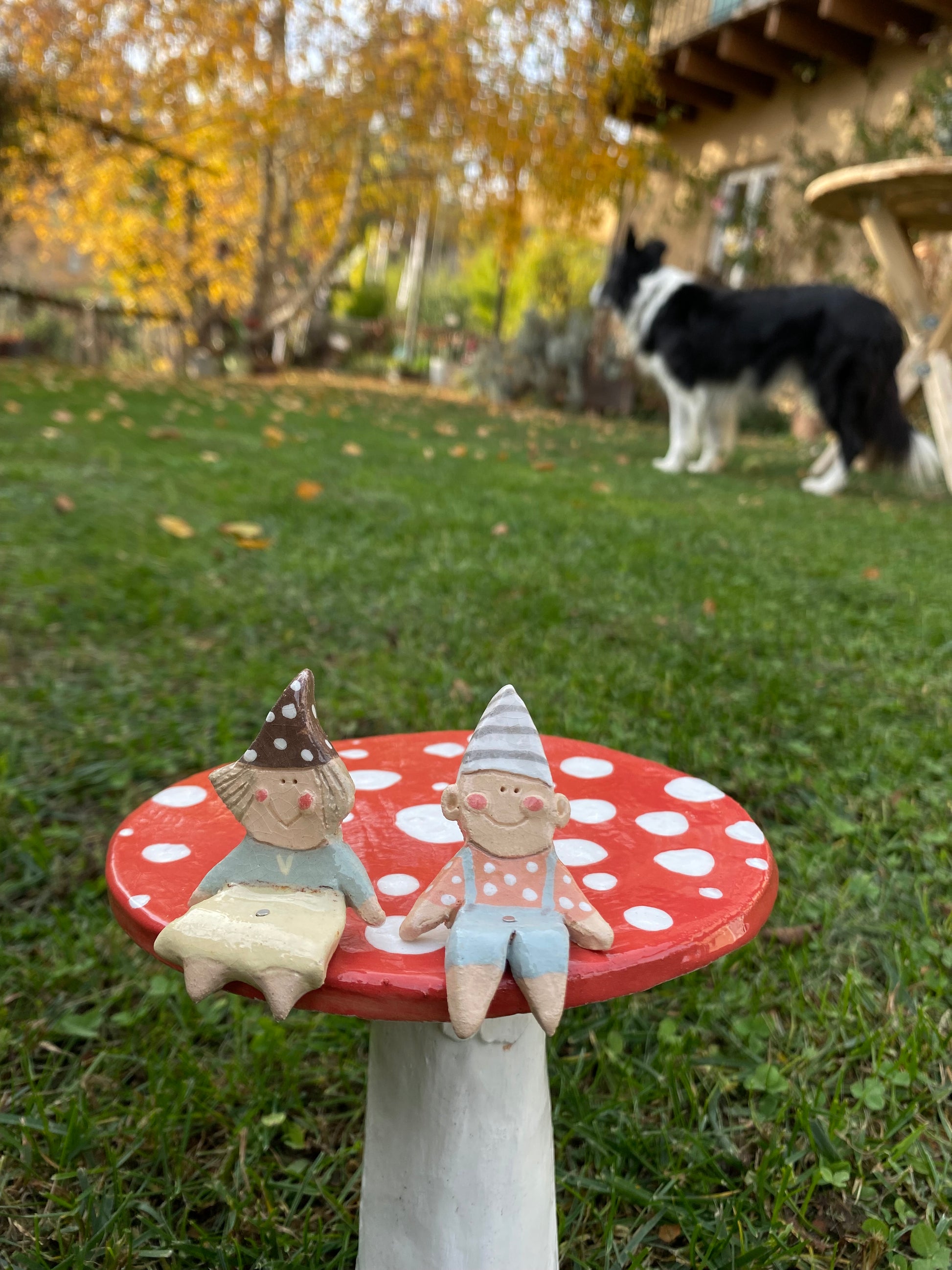 Un fungo alto circa 14 cm con 2 folletti del bosco seduti.