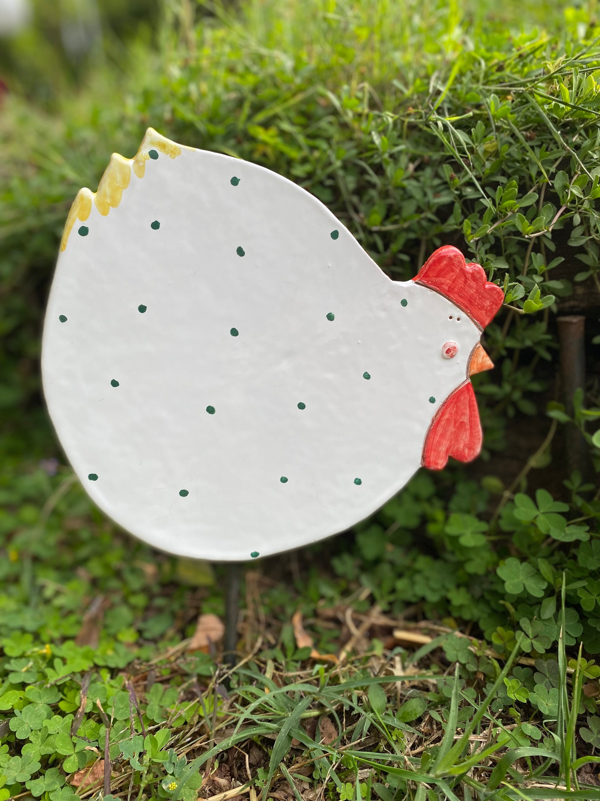 Gallina decorativa per il giardino da infilare nel terreno con un tondino in ferro incluso alto circa 20 cm.